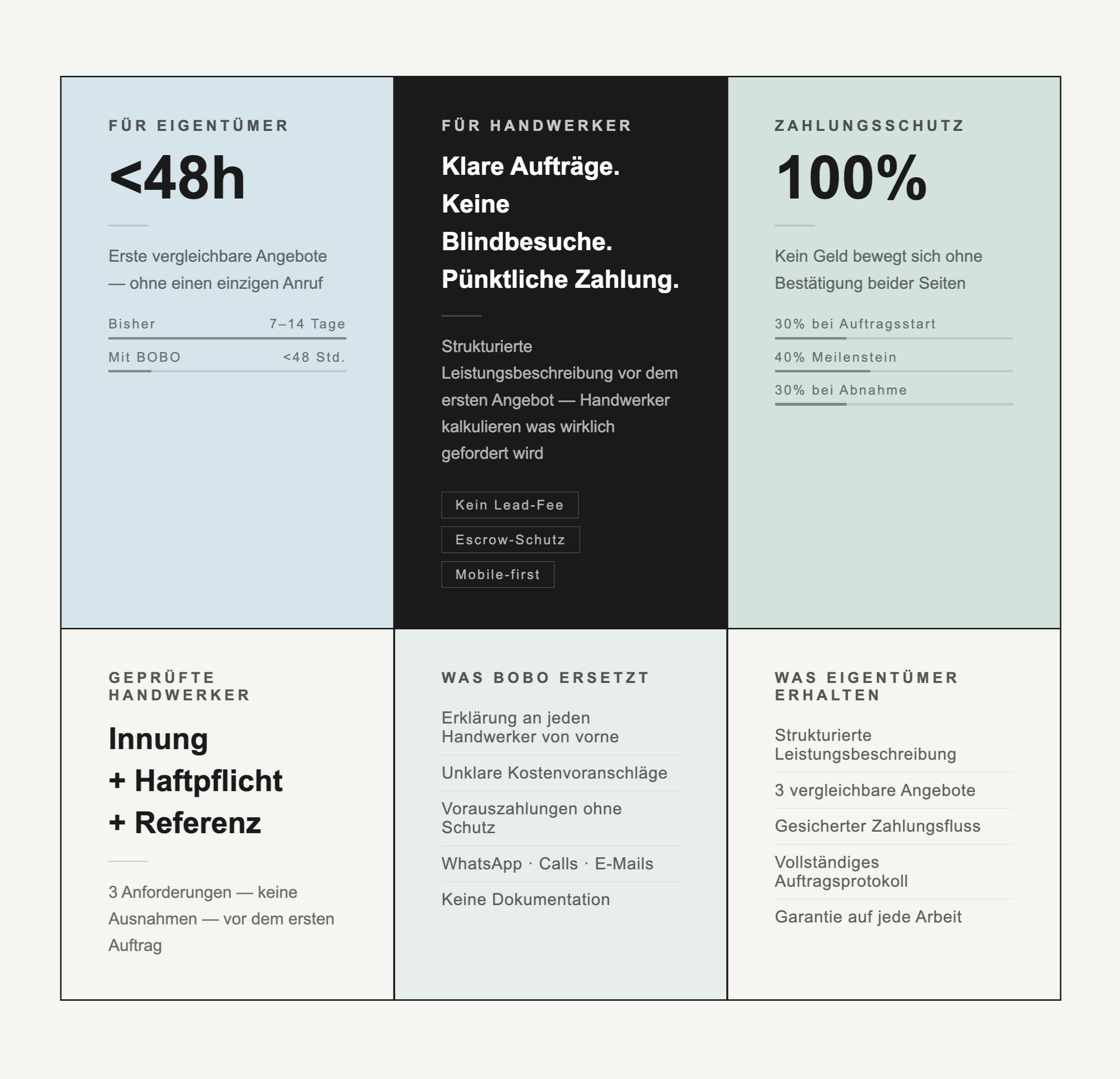 BOBO verbindet Eigentümer und Hausverwaltungen mit geprüften Handwerkern durch einen klaren Prozess: strukturierte Leistungsbeschreibung, vergleichbare Angebote, sichere Zahlung. Bei jedem Auftrag.